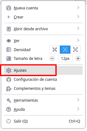 1. Entra a Ajustes de Thunderbird desde el menú de opciones arriba a la derecha.
