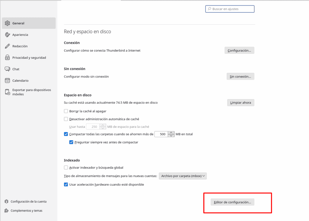 2. Dentro de la ventana de Ajustes, scrollea la pagina hasta abajo al final, y encontrarás un botón llamado «Editor de Configuración».