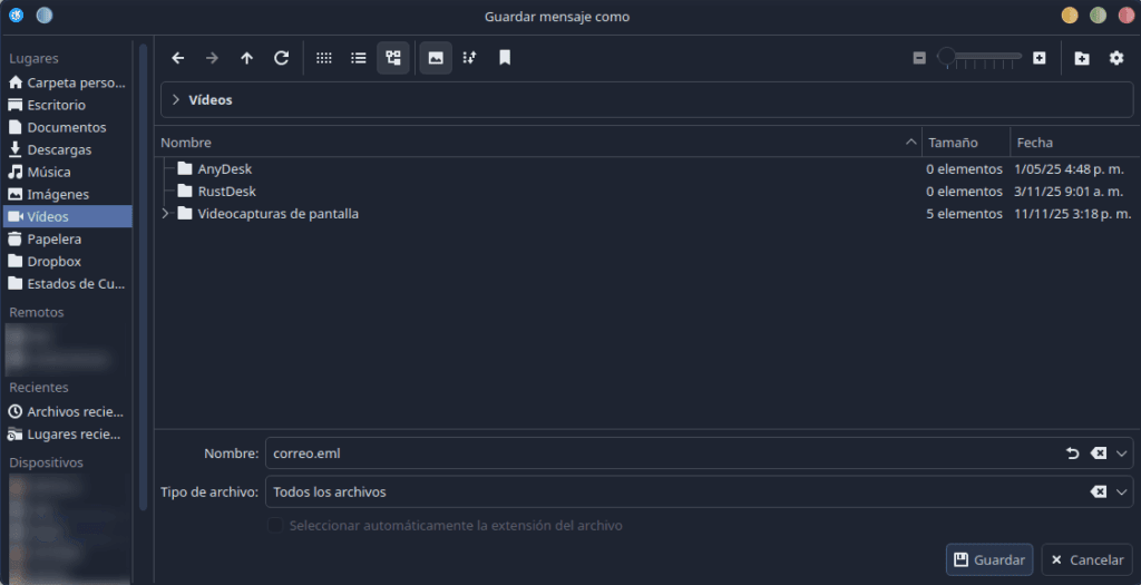 Ahora cuando quieras guardar un correo te aparecerá el cuadro de dialogo o File Save As de KDE y no el de GNOME.