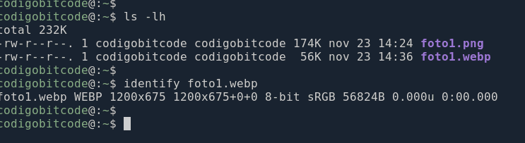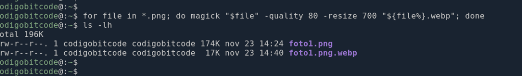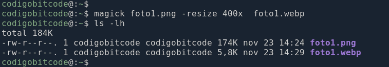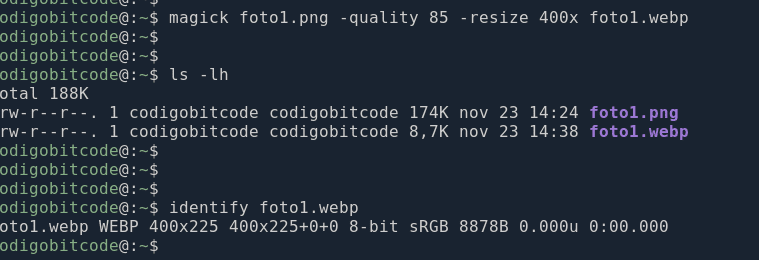 Con esto, le estamos diciendo al comando que el archivo foto1.png sea transformado a formato WEBP pero reduciendo la resolución de la foto a un ancho de 400px como máximo.